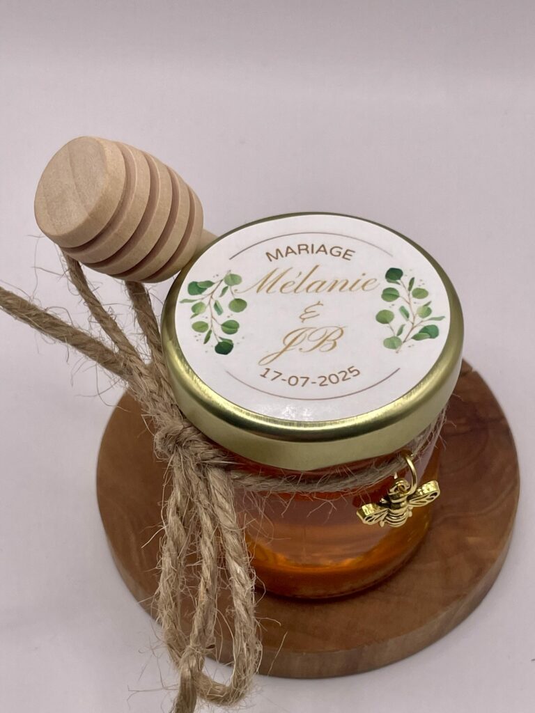 Le petit pot de miel personnalisé, parfait pour votre mariage, baptême ou tout autre événement festif, est le cadeau idéal pour marquer votre grand jour. Fabriquer à partir du miel de mon propre rucher, il offre une douceur naturelle et saine. Présenté dans un format élégant, chaque pot peut être personnalisé avec un ruban et une étiquette, avec plusieurs couleurs disponibles, pour s’adapter parfaitement à votre thème. Un geste attentionné pour vos invités, mais aussi une belle décoration pour vos tables de fête.