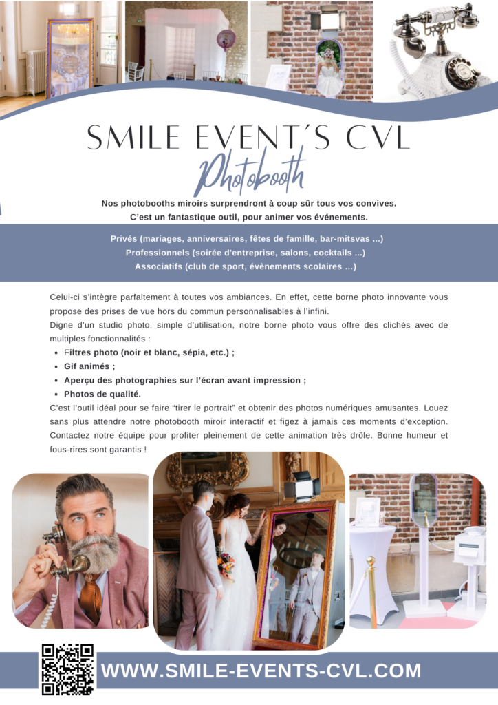 Smile Event’s Photobooth vous fait découvrir l’animation tendance et originale qui réunira tous vos invités et rendra votre mariage vraiment spécial et inoubliable ! Vous aurez l’assurance de passer un bon moment. La diversion et le fun seront au programme.